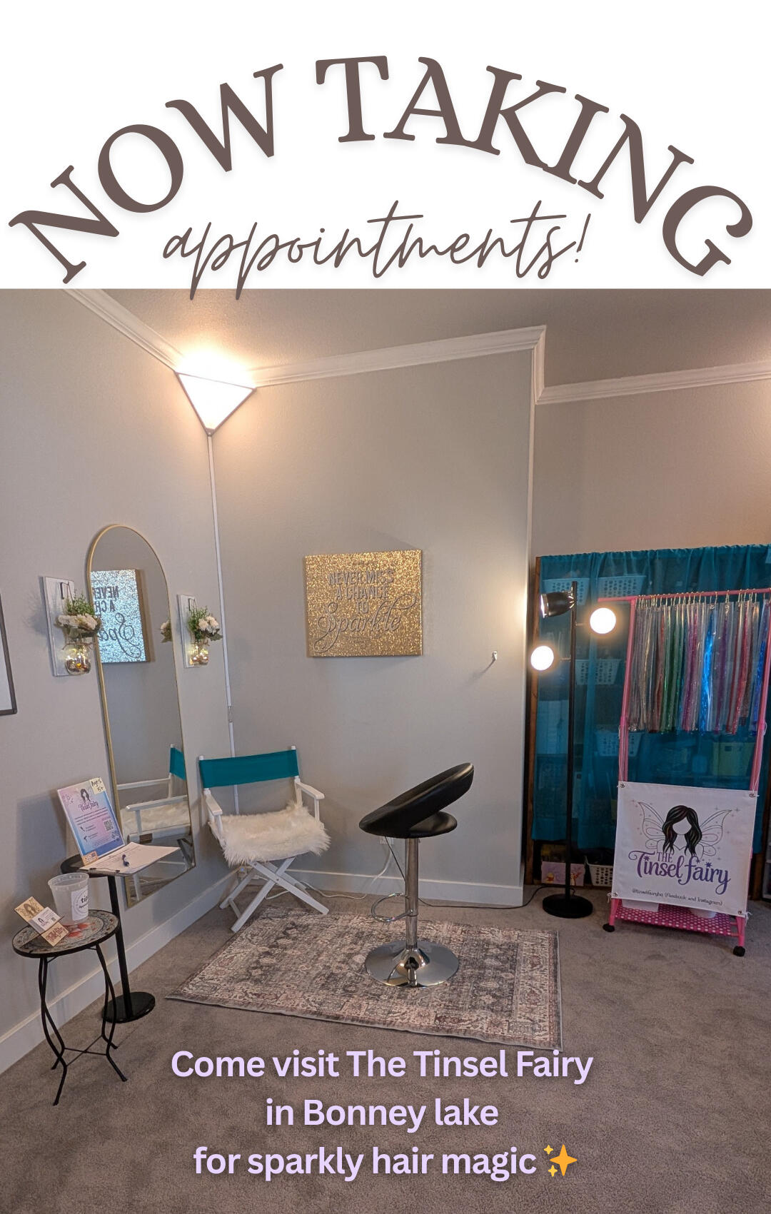 I’m based in Bonney Lake, WA, and you can find me at various pop-up events in the area! To see where I’ll be next, check out my social media pages for the latest events. I also offer mobile tinsel services for parties and groups of at least five people—I’m happy to bring the sparkle to you! Reach out for more information.